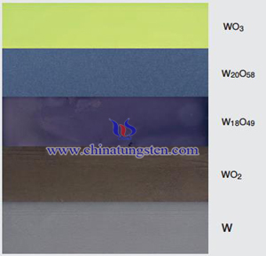 오른쪽 그림의 아래에서 위로 W는 텅스텐 분말이며 WO 2 는 이산화 텅스텐입니다. W 18 O W20은 청색 텅스텐 산화물이고, WO3은 황색 텅스텐 산화물이다.